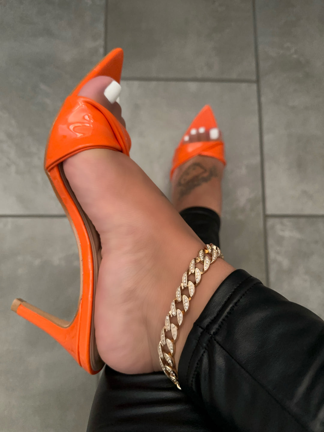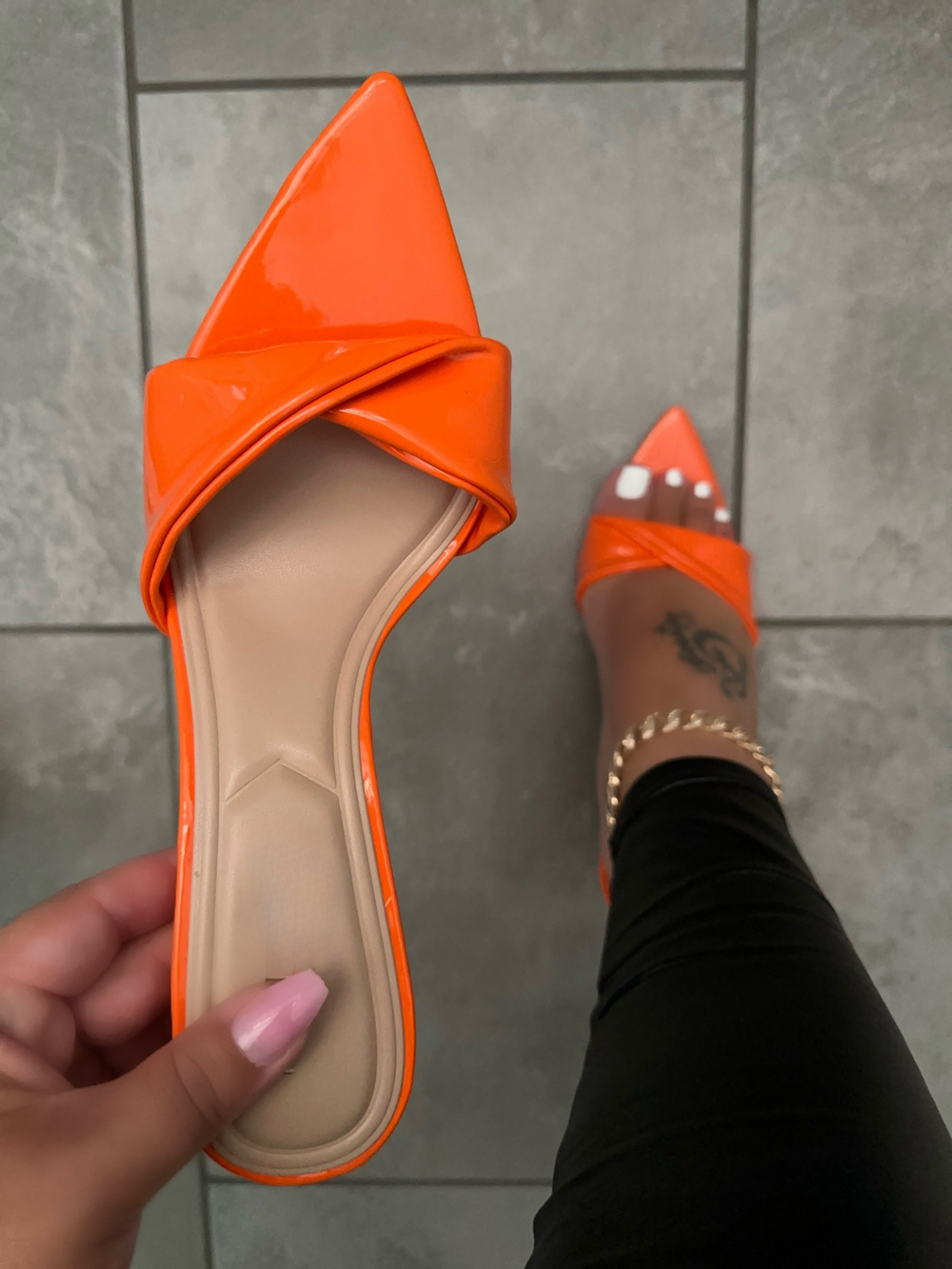 Bright Orange Patent Pointed Toe Mule Heels- Lynette